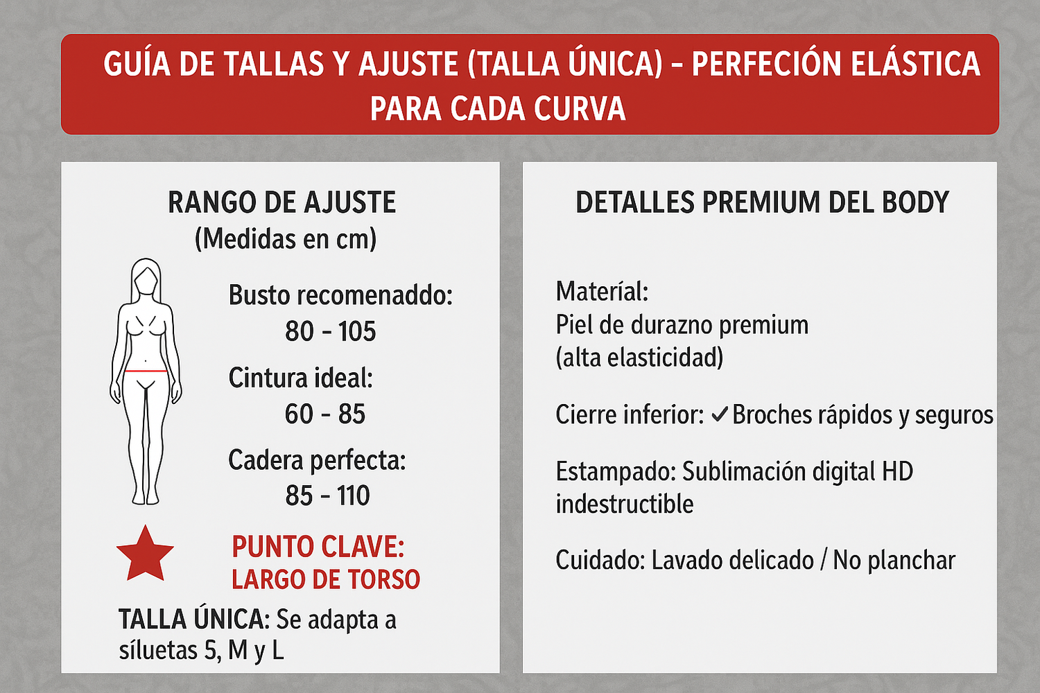 Nuestro body está diseñado con una tela de Piel de Durazno de alta elasticidad que se ajusta a múltiples siluetas. Es una Talla Única que se adapta perfectamente a tallas regulares S, M y L.